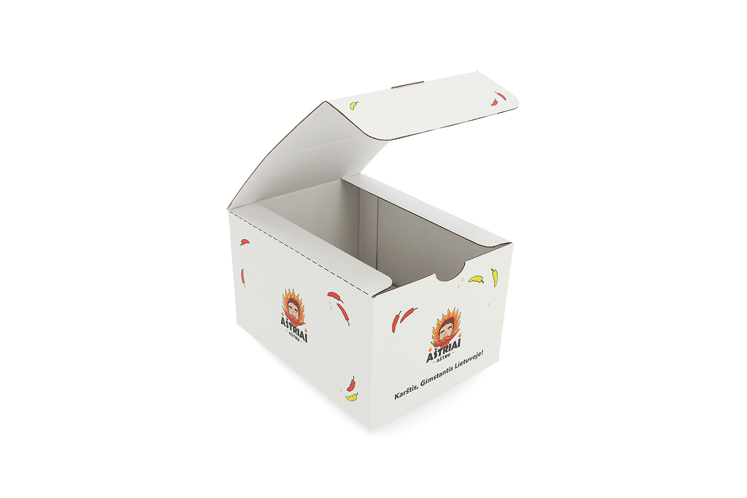 Patogi ir tvirta dėžutė iš vieno kartono lakšto, greitai sulankstoma ir uždaroma, idealiai tinkanti e‑komercijos siuntoms ir produktų transportavimui.