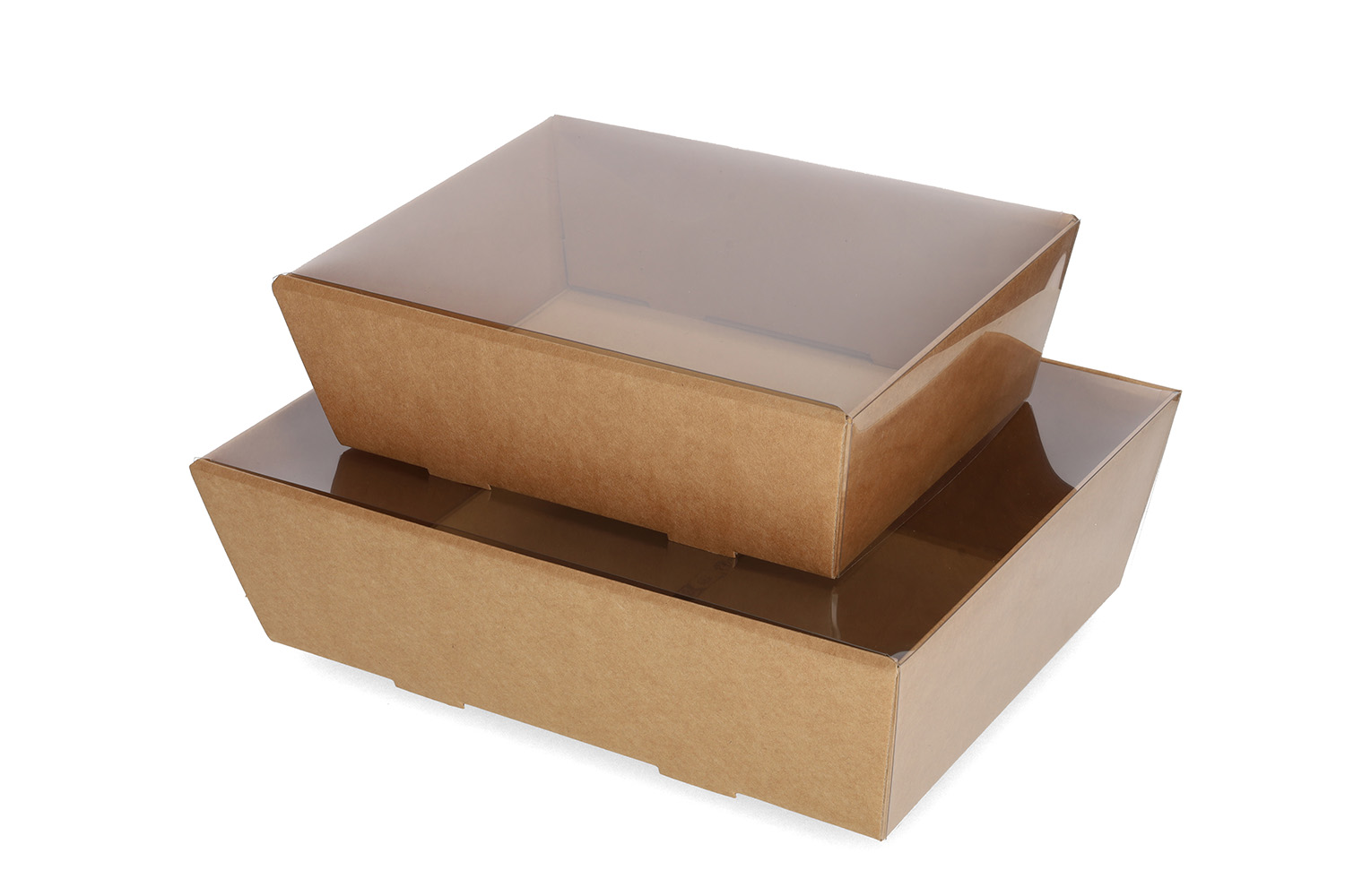 Dviejų dalių konstrukcijos dėžė, sukurta stilingam ir patogiam dovanų rinkinių pakavimui. Apatinė dėžės dalis pagaminta iš rudo E bangos gofruoto kartono, pasižyminčio tvirtumu ir stabilumu, o viršutinė – iš skaidraus PVC plastiko, kuris leidžia aiškiai matyti dėžės turinį.